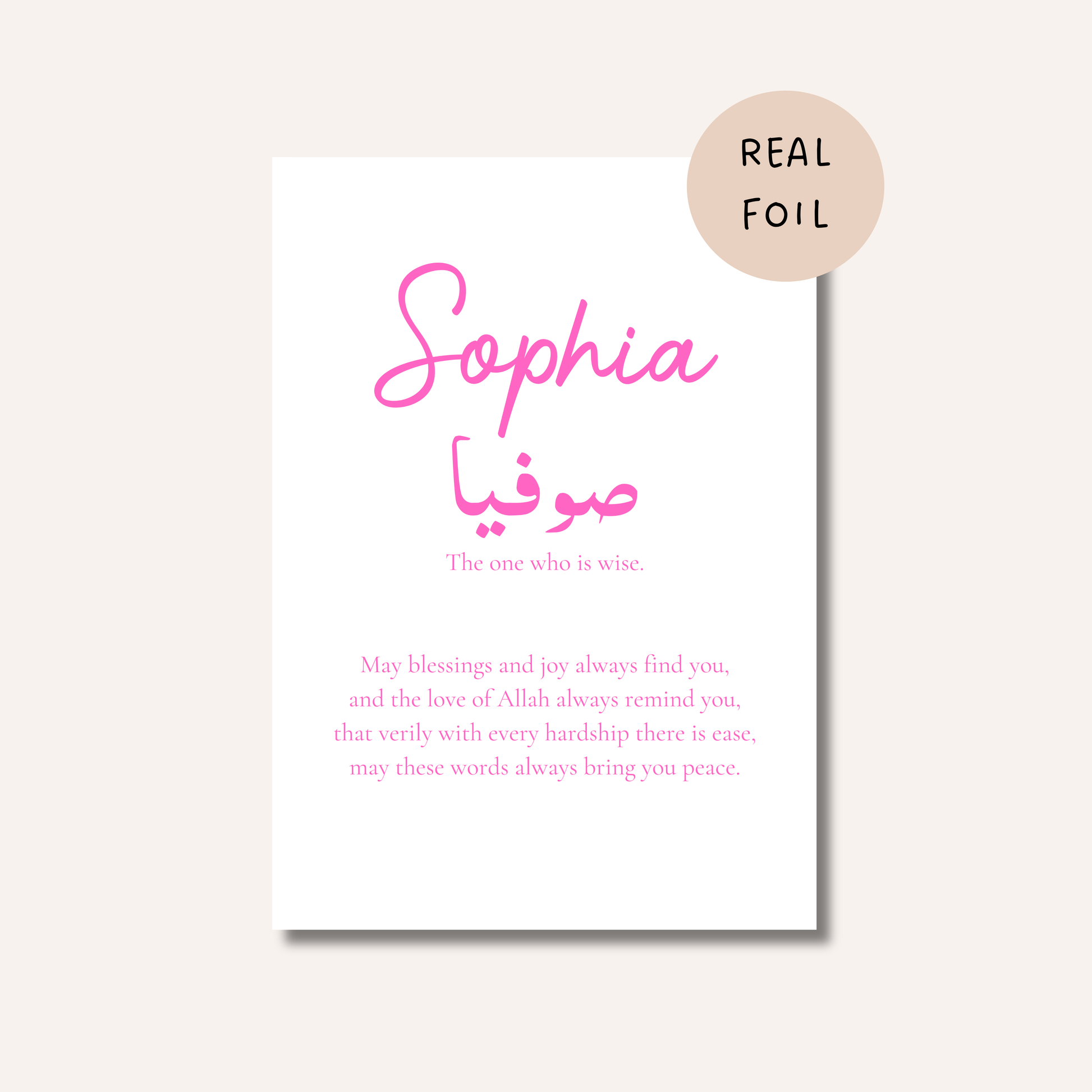 The personalised Islamic name print is a timeless faith-based item inspired by the Qur’an. Designed as a beautiful keepsake, this piece makes a meaningful luxury gift for all.